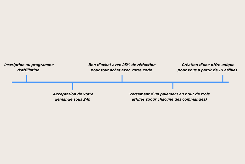 En rejoignant notre nouveau programme d'affiliation, vous bénéficiez de réductions sur vos commandes. Obtenez directement un versement sans obligation d'achat à partir de 3 affiliés.